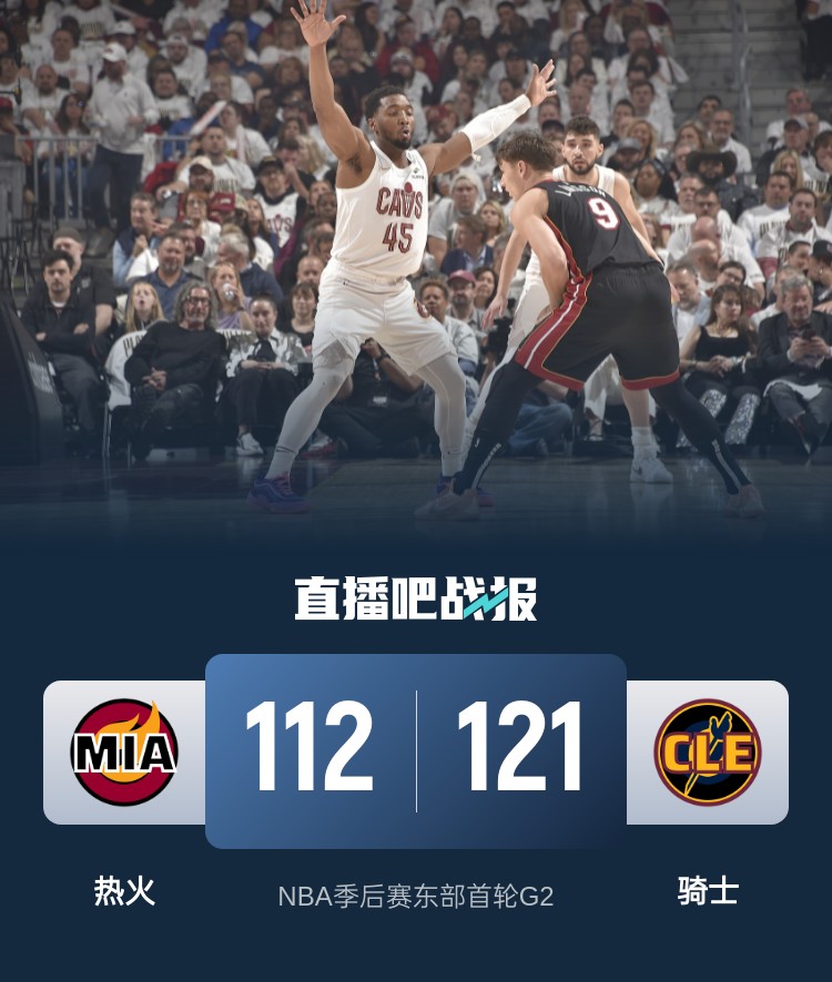 比赛上来,热火就反客为主打出8-2的开局取得领先,不过骑士此后作出调整并完成反超,次节场上局势开始偏向骑士一侧,他们攻势如潮单节狂轰43分净胜16分,半场结束时热火已经落后17分;下半场回来,两队一直保持拉锯,分差一直没有发生太大改变,不过到了末节骑士的进攻有所下滑,小米切尔连拿四分后分差回到个位数,关键时刻多诺万-米切尔也站了出来,个人连拿十分直接遏制住对手的势头,最终骑士再胜热火,大比分2-0领先。