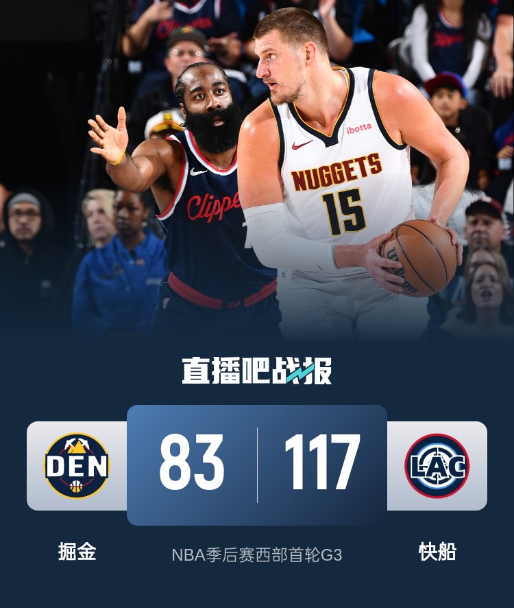 首节对决掘金在主力对决中更占上风,节中穆雷和戈登的连续三分帮助他们最多取得7分优势,但这是他们表现最好的阶段也是本场拿到的最大领先;哈登在随后连续单挑轰进三记三分独得11分,快船首节末送上16-2的攻势直接扭转局势;次节初快船又送上一波7-0的攻势继续扩大领先;掘金方面攻防全面落入被动次节仅得19分,哈登半场20分的表现帮助快船拿到18分优势进入下半场。休息归来快船再送8-3的开局攻势并确立起20分以上的优势牢牢控制局面;末节更是靠着强硬防守6分钟里仅丢8分稳守大比分优势,掘金也在随后早早撤下主力。最终,快船主场轻取掘金,并在大比分上2-1反超掘金。