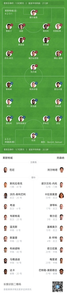 莱斯特城替补:41-斯托拉奇克、25-沃约-库利巴利、4-考迪、23-韦斯特高、8-温克斯、22-斯基普、40-布纳诺特、10-马维迪迪、20-达卡