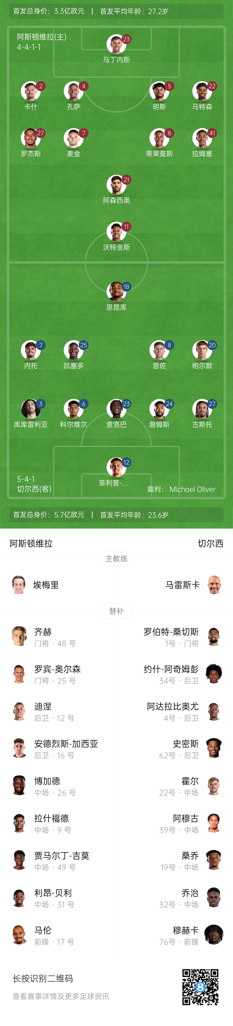 维拉首发:23-马丁内斯、2-卡什、4-孔萨、5-明斯、22-马特森、7-麦金、8-蒂莱曼斯、21-阿森西奥、41-雅各布-拉姆塞、27-摩根-罗杰斯、11-沃特金斯