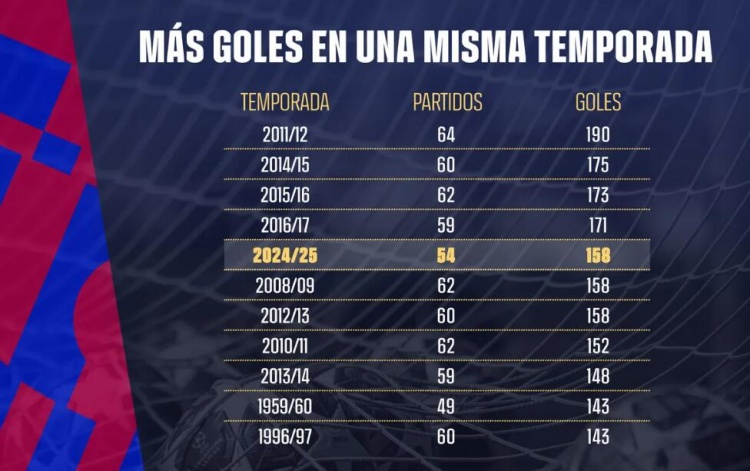 巴萨单赛季进球数排行:本赛季已打进158球排在队史第5