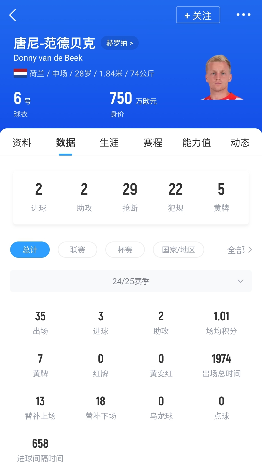 本赛季范德贝克为赫罗纳出战35场比赛,贡献3球2助,球员德转身价近5年首度迎来上涨,目前为750万欧,球员巅峰身价5500万欧。