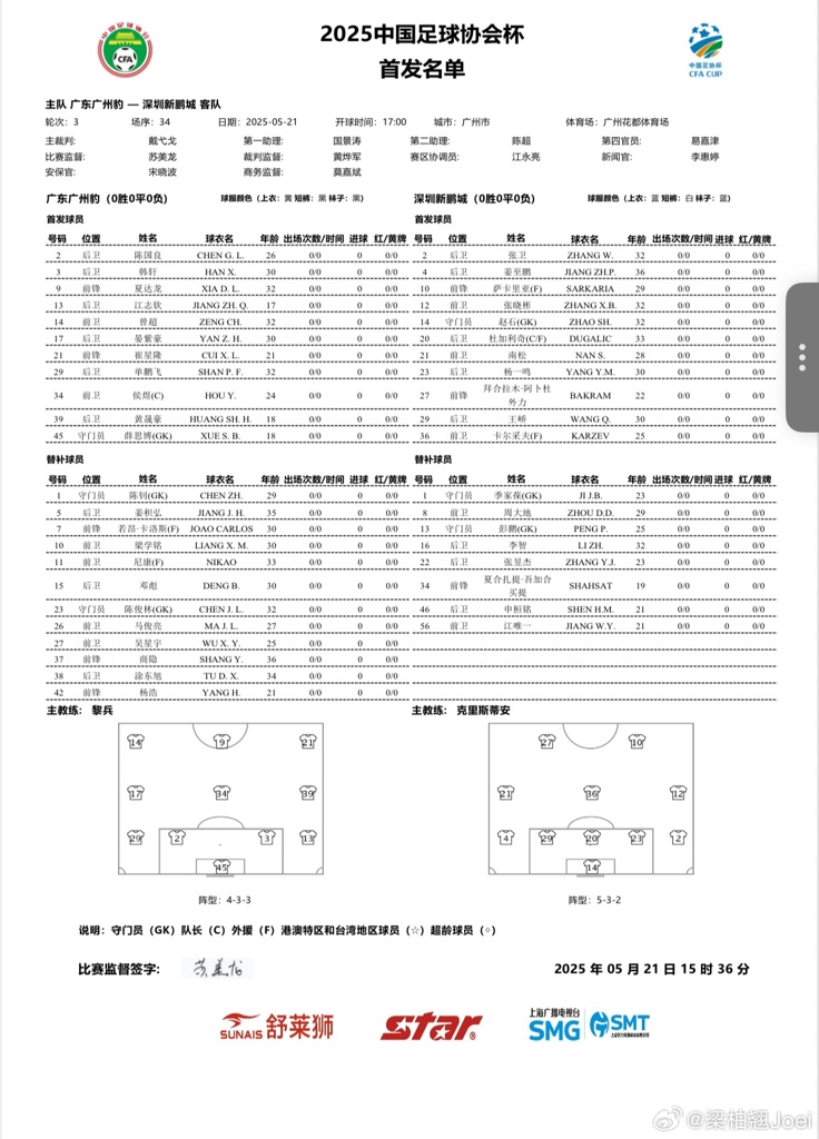 05月21日讯 今天17点足协杯第3轮,中甲广东广州豹迎战中超深圳新鹏城,赛前首发名单公布。