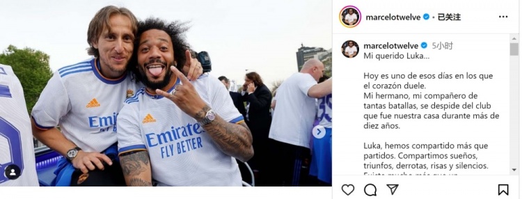 5月23日讯 皇马官方宣布莫德里奇世俱杯结束后离队,马塞洛社媒发文,致敬曾经的队友。