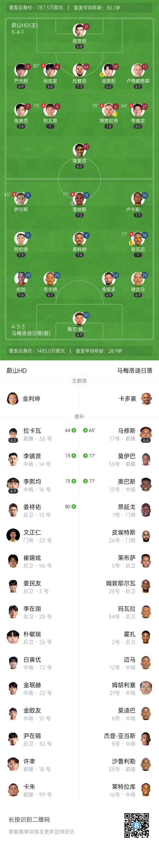 第43分钟,马梅洛迪日落右路定位球机会,莫科纳直接打门被赵贤祐飞身扑出。↓