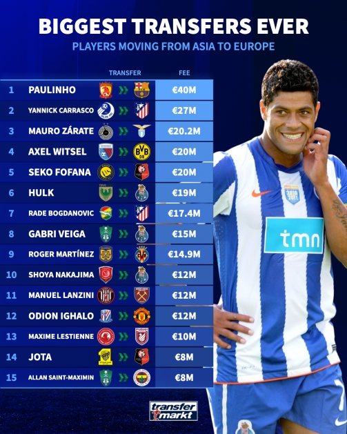 亚洲→欧洲最贵转会:4000万欧保利尼奥霸榜!卡拉斯科伊哈洛在列