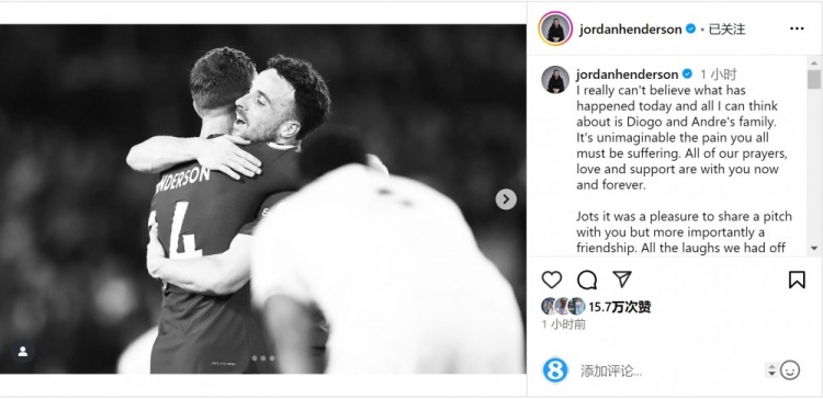 亨德森社媒晒出与若塔拥抱的照片,并写道:“我真的无法相信今天发生的事情,我满脑子想的都是迪奥戈和安德烈的家人。你们现在所承受的痛苦是无法想象的。我们所有的祈祷、爱和支持都与你们同在,从现在直到永远。