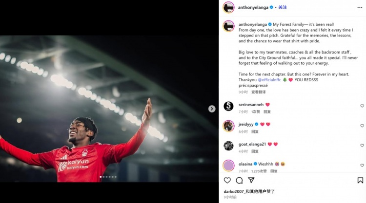 7月13日讯 纽卡已经官宣从诺丁汉森林签下伊兰加,后者也通过社媒发文告别。