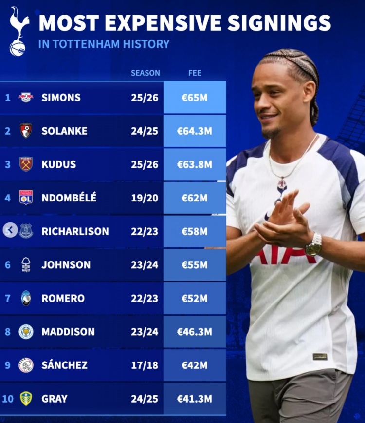 列维热刺生涯最贵引援榜:西蒙斯压索兰克成标王,孙兴慜未进前十