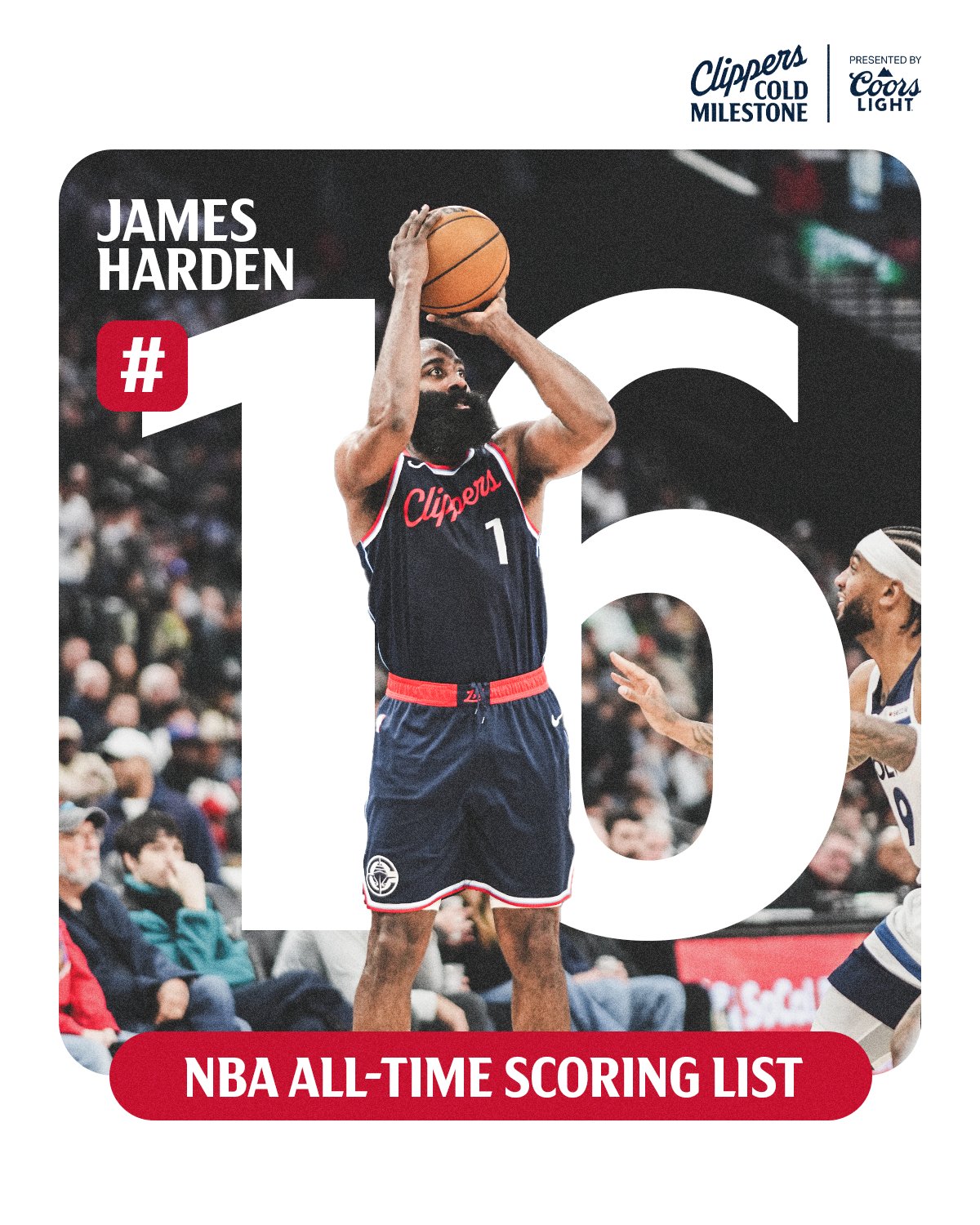 本场比赛哈登得到19分8篮板3助攻1抢断1盖帽,生涯总得分(26503分)超越邓肯(26496分),升至NBA历史第16位!
