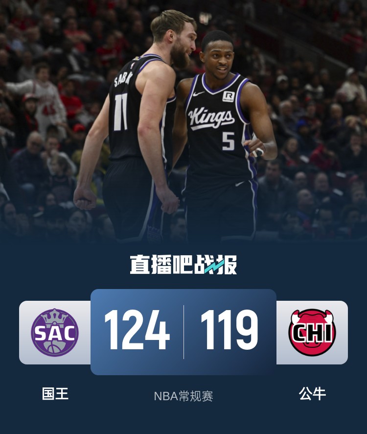 比赛开始,小萨有攻有传带队开局,公牛则是首发五虎接连得分回应,随后双方展开对攻战,穆雷加长压哨三分命中助国王首节领先2分,次节双方继续展开对攻拉锯战,国王继续全民皆兵,球哥接连三分命中回应,拉文里突外投连续取分,公牛半场反超2分。下半场,双方继续对攻战,蒙克串联进攻,福克斯接连三分命中,但拉文单节12分也能给出回应,三节国王再反超2分,末节塔克接连三分命中,德罗赞接连中远投强势回应,分差始终胶着,比赛进入白热化,福克斯两罚全中后领先3分,公牛多次浪费机会,基迪致命发球5秒失误,最终国王124-119险胜公牛,拿到7连胜。