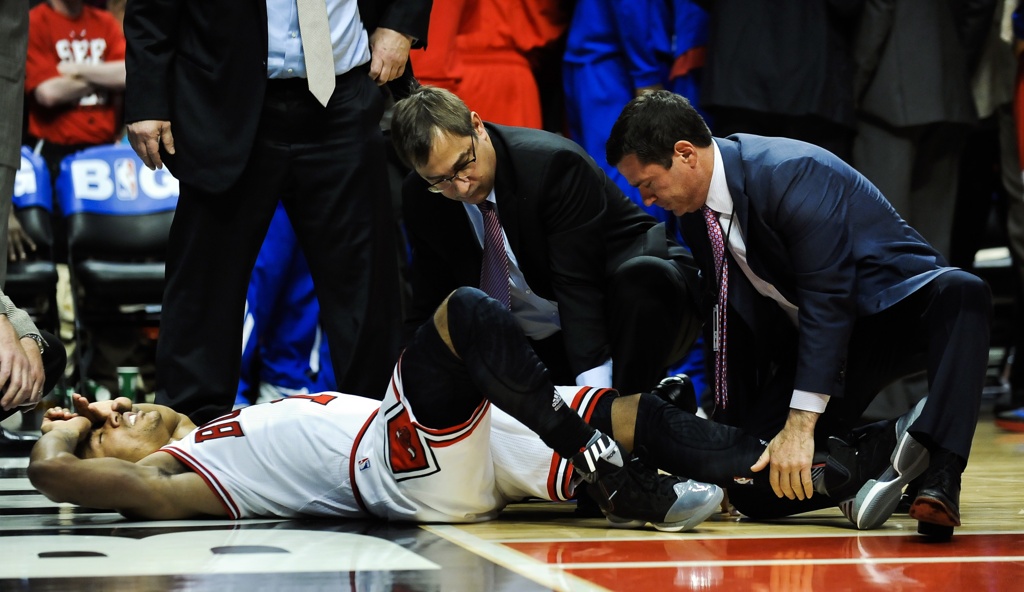 2012年4月28日,在公牛与76人的季后赛首轮第一场比赛中,罗斯在一次突破变向时,右膝突然扭曲,随后痛苦倒地。经诊断,罗斯遭遇了右膝前交叉韧带撕裂。