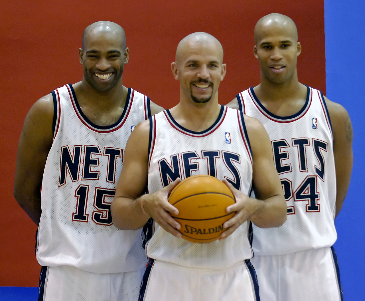 卡特、基德、理查德-杰弗森组成了篮网的“三驾马车”,控场大师基德是球队的灵魂舵手,卡特和杰弗森两个顶级侧翼运动能力炸裂,基德在后场送出纵贯全场的远距离精准制导,卡特和杰弗森犹如划破天际的闪电以雷霆万钧之势空接重扣,这种进攻方式堪称新泽西篮网三巨头最经典的一幕。