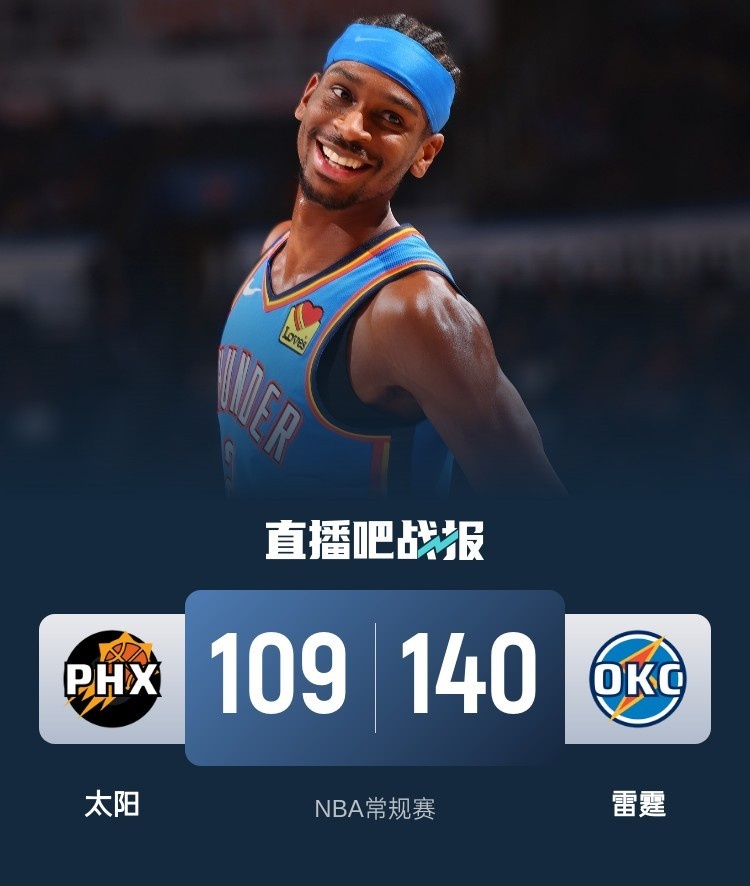 此役一上来双方找到手感拉开对攻,布克和比尔轮番杀伤,奥尼尔外线续上火力,但亚历山大连投带罚予取予求,首节结束时雷霆领先4分,次节回来,雷霆进攻稍有停滞,太阳抓住机会一波12-2实现反超,双方分差一度来到两位数,亚历山大单节15分稳住局势,半场战罢,太阳反超2分。易边再战后太阳进攻突然断电,雷霆顺势轰出20-2进攻高潮,三节结束后雷霆确立25分优势,末节上来,太阳追分无望早早撤下主力,比赛提前失去悬念,最终雷霆140-109大胜对手。