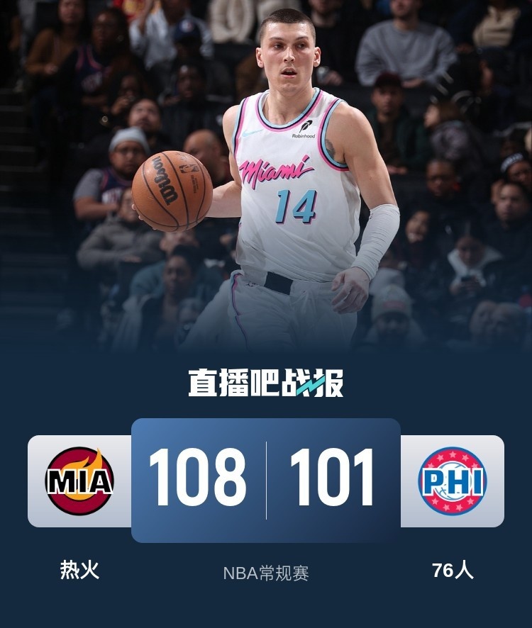 首节开打后双方迅速进入状态,希罗连投带罚不断取分,马克西联手乌布雷及时回应,首节结束时热火领先4分,次节回来,罗齐尔和约维奇扮演奇兵接连取分,76人多点开花紧咬比分,两队你来我往陷入缠斗,半场战罢,热火依然领先5分。易边再战后双方火力放缓,希罗延续手感予取予求,三节结束后热火将优势扩大到7分,末节上来,双方鏖战至最后时刻,马克西三分保留悬念,但希罗关键上篮打进后76人追分未果,最终热火108-101力克对手。