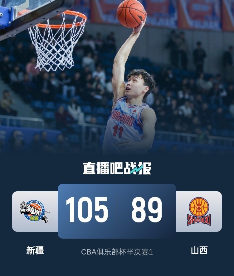 比赛开始,双方开场短暂相持,随后新疆持续发力取得两位数领先,山西不断冲击内线连投带罚努力追赶,次节迪亚洛内外开花帮助球队迅速迫近比分,新疆命中率下降,山西双外援联手带队一度反超,半场战罢两队战成54平。易边再战,山西命中率骤降,新疆利用防守反击重获两位数优势,末节新疆越战越勇继续扩大优势,山西大势已去无力回天。最终,新疆105-89击败山西,率先挺进决赛。新疆决赛的对手将是北京和上海的胜者。