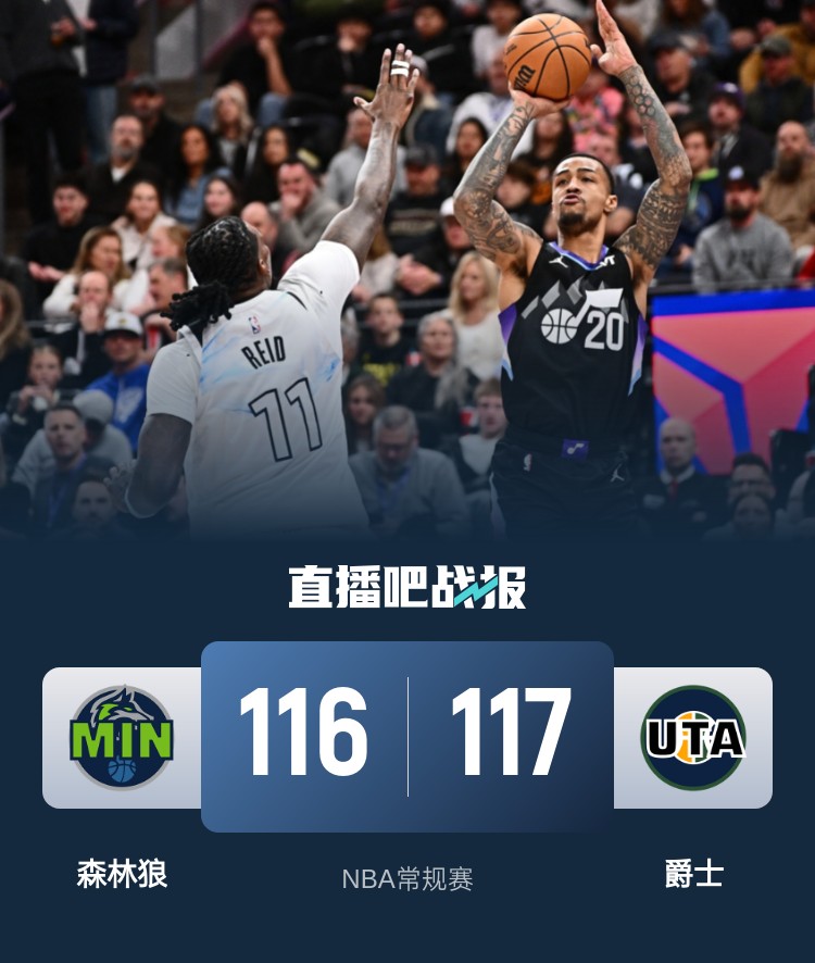 开场后爵士率先进入状态以8-0开局,森林狼外线逐渐找到手感连连追分,但他们防守端表现不佳完全没有限制住爵士的进攻,两队大打对攻战,外线也是多次对飚三分,靠着麦克丹尼尔斯的抛投森林狼反超2分结束首节。次节上来森林狼又是两记三分扩大优势,爵士命中率下降,里德状态神勇帮森林狼将分差拉大到两位数。易边再战,爵士重振旗鼓上来一波27-4的攻势将比分反超,随后森林狼找回感觉在三节结束时追上比分,最后一节两队依旧是拉锯战,凯斯勒乱战中扣篮得手帮助爵士手握一分优势,森林狼最后一攻失误,最终爵士117-116险胜森林狼,森林狼遭遇2连败。