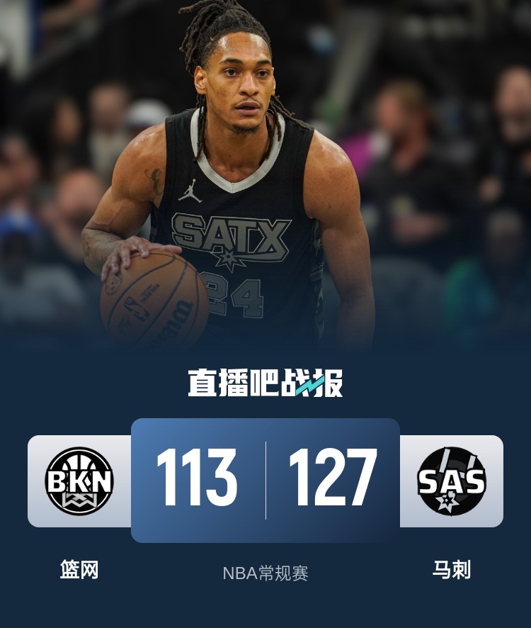 首节之争马刺外线手感不错接连命中四记三分并拿到18-9的领先;不过篮网这边能够匹配上进攻强度一直紧咬比分;次节两队更是双双砍下30+的单节得分,整个上半场马刺虽然一直保持领先但几次尝试拉开比分都无功而返,凯尔登和福克斯最后极限进球为马刺拿到5分领先进入下半场。休息归来马刺抢开局一波12-5的攻势拉开两位数领先,这之后马刺接管比赛越战越勇,瓦塞尔末段连续两记三分,马刺再送一波19-8的攻势将分差拉大至25分;巨大分差也让比赛早早失去悬念,马刺末节保留主力稳住大比分优势后鸣金收兵。最终,马刺主场轻取篮网拿下比赛。