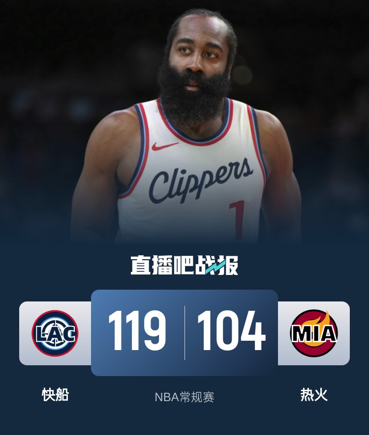 比赛开始,博格丹-博格达诺维奇上来连续中远投命中,哈登各种单挑或造杀伤取分,快船顺势建立主动权,首节快船领先10分,次节热火替补拼抢积极连续三分追分,但哈登接连串联,祖巴茨内线打成给出回应,但热火全民皆兵半场还是追到差5分。下半场,双方继续拉锯战,哈登虽然进攻手感不佳,但能送助攻,祖巴茨继续内线得吃得喝,希罗单节上双苦苦支撑,三节快船还领先8分,末节博格丹上来手感火热,里突外投连砍9分直接带队拉开比分,随后快船牢牢掌握住十几分领先,最终快船119-104力克热火,送对手5连败。