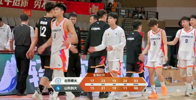 末节决战,苏克手感火热接连远投命中带领北京师范大学打出9-1的开局,王焕雄连得5分止血,此后北京师范大学进攻依旧稳定,场上分差一直保持在两位数,全场比赛结束,北京师范大学83-66击败山东科技大学。