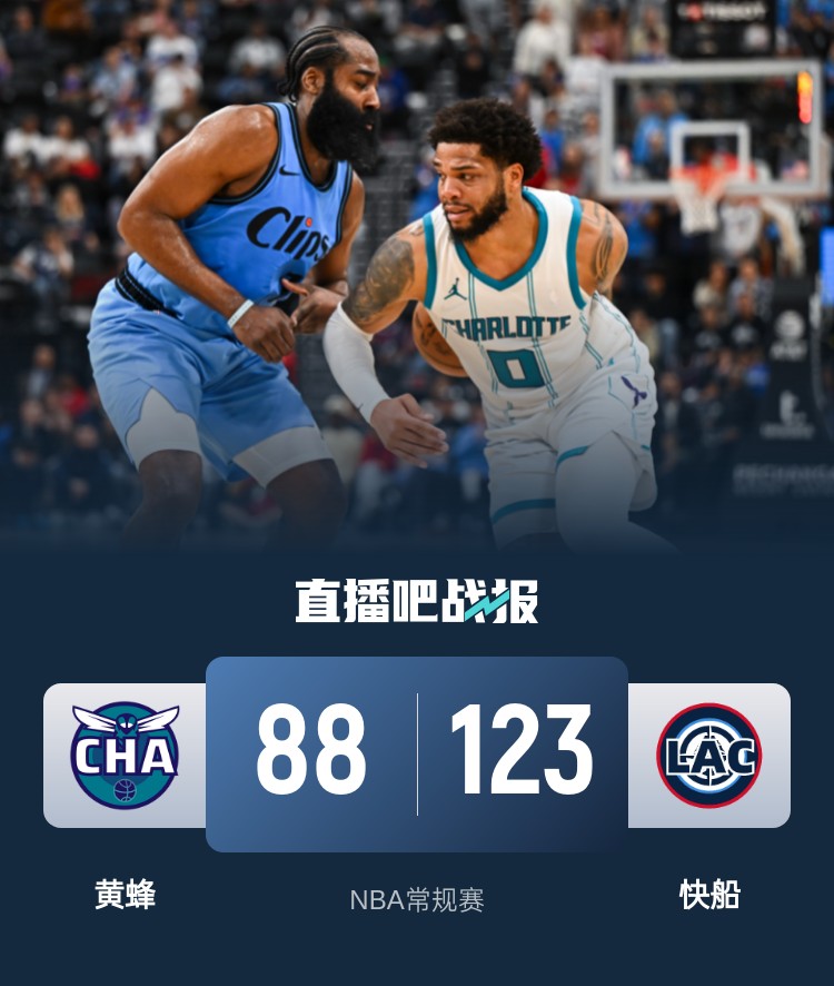 比赛开始,哈登率先打出状态连砍7分,但三球和马威接连内线强攻回应,随后哈登里突外投又是连砍6分带队领先双位数,次节双方命中率都有下降,小卡和巴图姆接连三分命中,哈登也有三罚,快船轰出16-4攻击波一举拉开20分以上领先,半场快船领先24分。下半场,小卡开始发力,里突外投单节得分上双,哈登继续状态不错,快船顺势拉开30分以上领先,末节双方拉锯战,快船留鲍威尔在场上带替补找状态,快船一度拉开近40分的领先,最终快船123-88大胜黄蜂,拿到3连胜。
