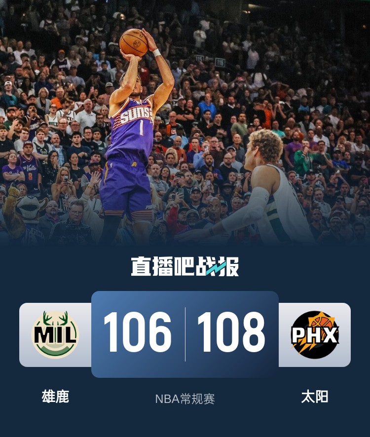 3月25日讯 NBA常规赛,太阳主场迎战雄鹿。太阳34胜37负西部第11,雄鹿40胜30负东部第5。此役利拉德和比尔都不打。