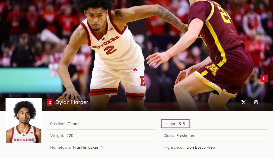 迪伦-哈珀现年19岁,身高1米98,体重约100公斤,司职后卫,是NBA名宿、五冠球员罗恩-哈珀的儿子。2024-25赛季,迪伦-哈珀出战29场比赛,场均得到19.4分3.8篮板4.6助攻1.4抢断。