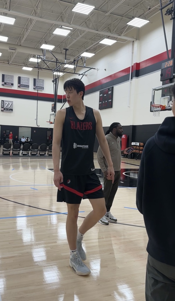 “看到杨瀚森穿上开拓者球衣还是挺神奇的,今天试训进行了一个半小时左右。流程大概是热身,投篮,强度投篮,然后全场3v3。同行试训的球员中,阿萨-纽厄尔,杰斯-理查德森,麦克尼利,弗莱明以及威尔-莱利都是模拟首轮甚至有乐透机会的球员,其中一名后卫,四位前锋,小杨是唯一的中锋。