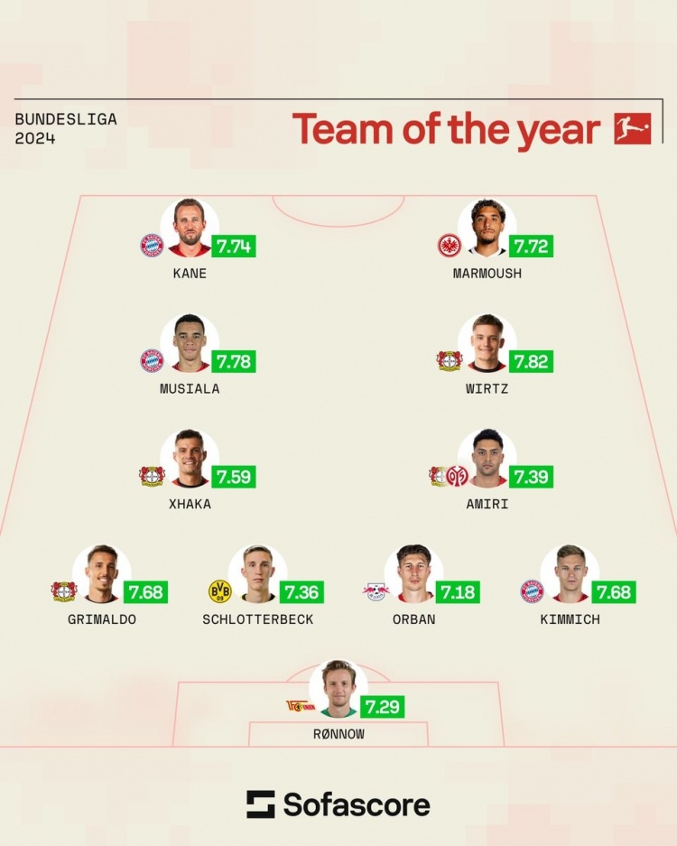 sofascore德甲年度最佳阵:凯恩、马尔穆什领衔,德国双星在列