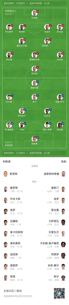 利物浦替补:56-雅罗斯、3-远藤航、7-路易斯-迪亚斯、10-麦卡利斯特、14-基耶萨、19-埃利奥特、20-若塔、21-齐米卡斯、78-宽萨