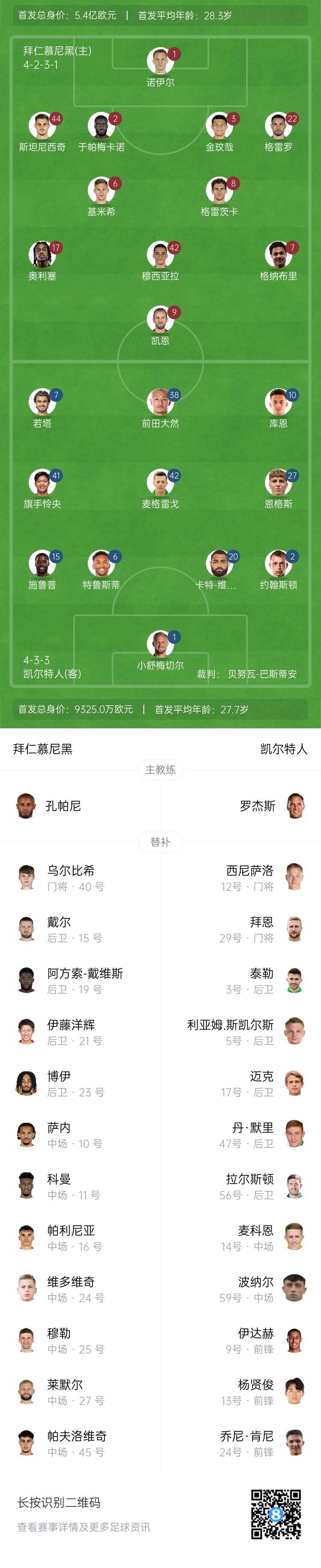 拜仁首发:1-诺伊尔、44-斯坦尼西奇、2-于帕梅卡诺、3-金玟哉、22-格雷罗、6-基米希、8-格雷茨卡、42-穆西亚拉、7-格纳布里、17-奥利塞、9-凯恩