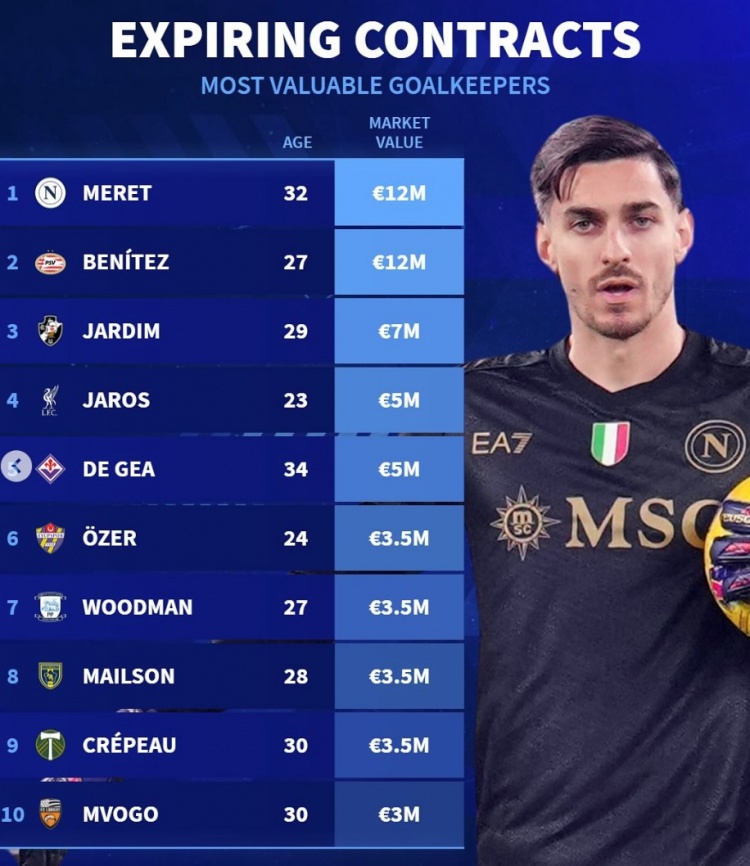 2月21日讯 《转会市场》统计了今年合同到期的门将身价情况,那不勒斯门将梅雷特并列居首。