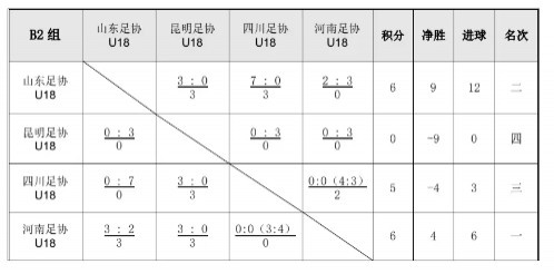 小组赛最后一轮,由于对手昆明足协U18队弃权,河南队凭借对阵山东的胜负关系优势,力压对手以小组头名的成绩进入到了接下来的排位赛。