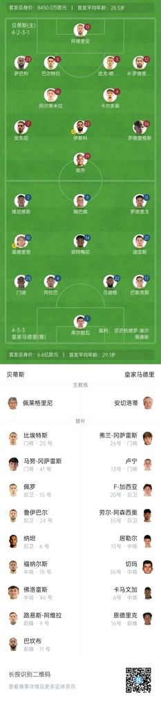 贝蒂斯首发:13-阿德里安、23-萨巴利、5-巴尔特拉、3-迭戈-略伦特、12-里卡多-罗德里格斯、4-卡尔多索、16-阿尔蒂米拉、7-安东尼、22-伊斯科、36-热苏斯-罗德里格斯、19-库乔